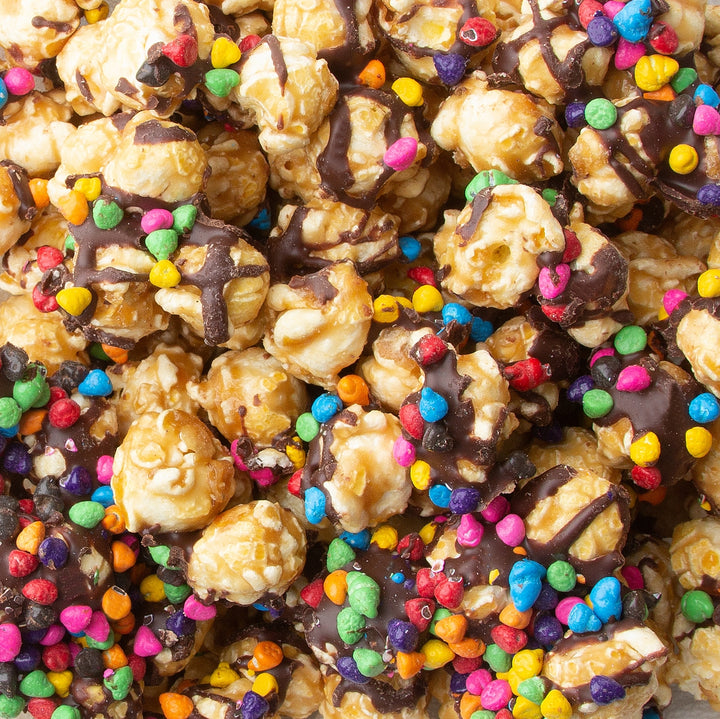 Indulge in an exquisite blend of flavors and textures with our Chocolate Drizzled Caramel Popcorn with Rainbow Chips. Each perfectly popped kernel is luxuriously coated in velvety caramel, then drizzled with rich, smooth chocolate. The finishing touch? A sprinkling of vibrant, hand-crafted rainbow chips that add a playful yet sophisticated crunch. This gourmet treat offers the perfect balance of sweetness, decadence, and color, making it the ideal gift for special occasions or an elegant indulgence for the discerning palate. Elevate your snacking experience with this unforgettable, artisanal popcorn.